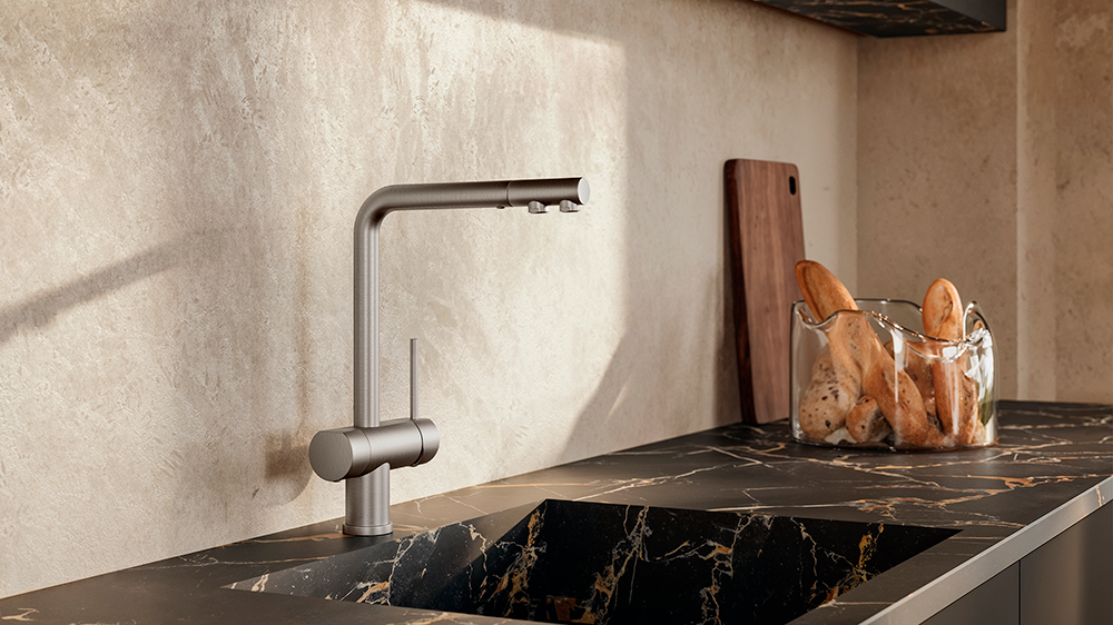 Steel Line, the new 316 stainless steel series, also makes its debut. With a fluted handle, slim levers, and versatile configurations—from the traditional spout to the pull-out spray and the bold front version—Steel Line brings elegance and practicality to both contemporary and professional kitchen projects.