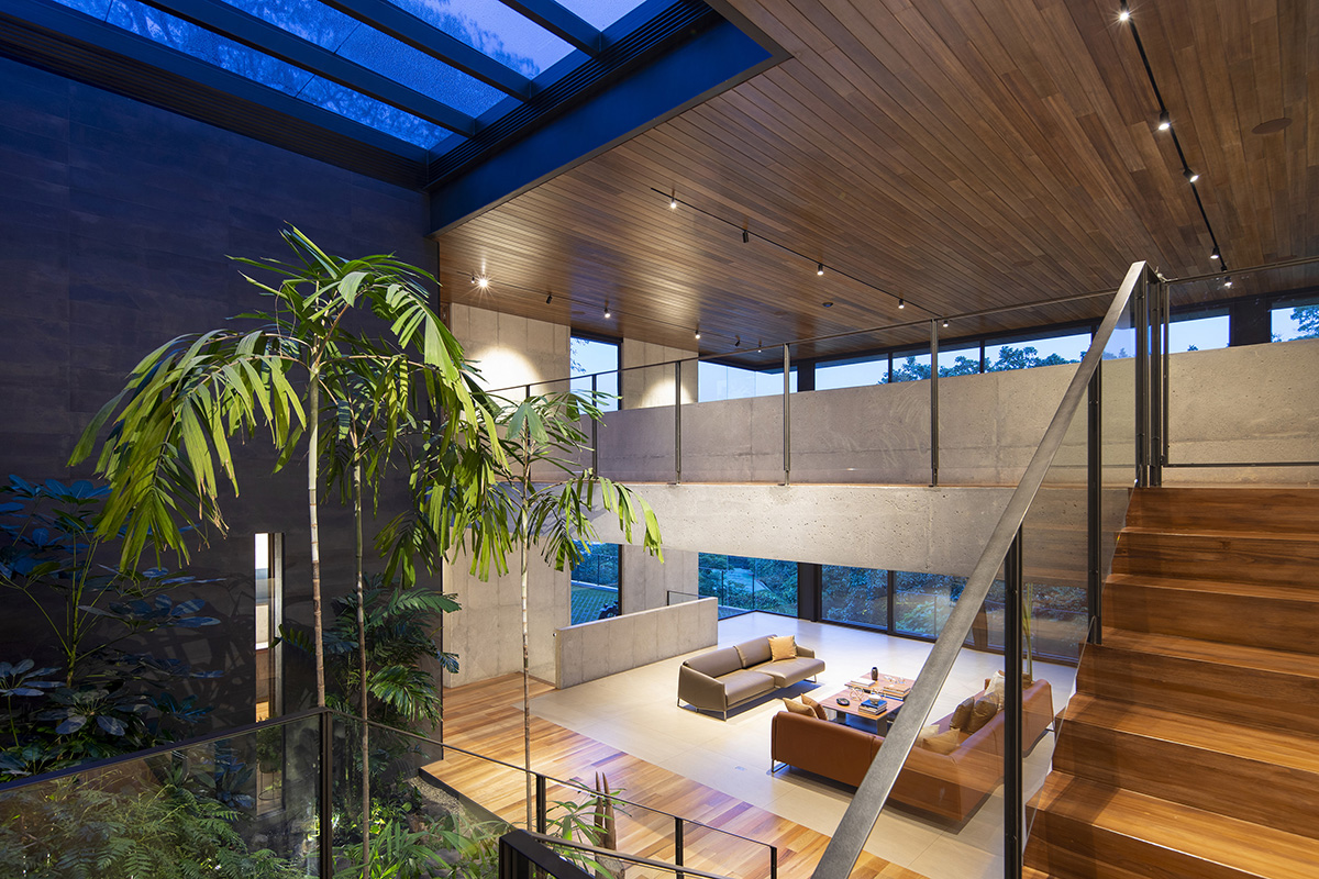 Spazi ampi e luminosi in cui si ripropongono gli elementi di una vera e propria foresta a misura d'uomo: dal legno degli interni alla selezione di piante tropicali presenti nei vari ambienti, tutto è stato progettato per creare una continuità tra la circostante natura incontaminata e il design interno di questa residenza privata.
